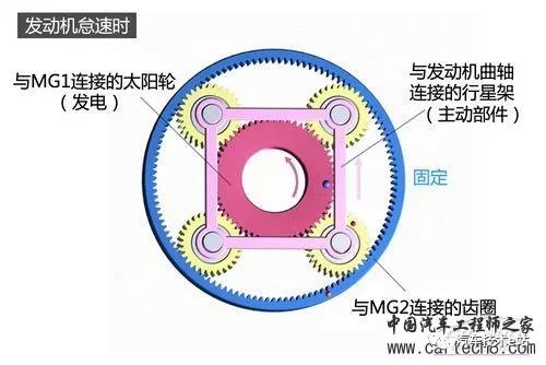 怠速时,电流流进MG2固定行星齿轮的齿圈,发动机带动行星架转动,行星架带动太阳轮转动,与太阳轮连接的MG1发电给电池充电。